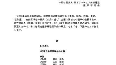JARL選挙2026に地方本部区域毎(東海)へ、静岡県東部地区から立候補しました。現在、令和6年度社員として活動をしています。JR2PMQの所信表明は、こちらをご覧ください。皆様の、ご支援をお願いします。選挙に関しての詳細は、JARLサイト...